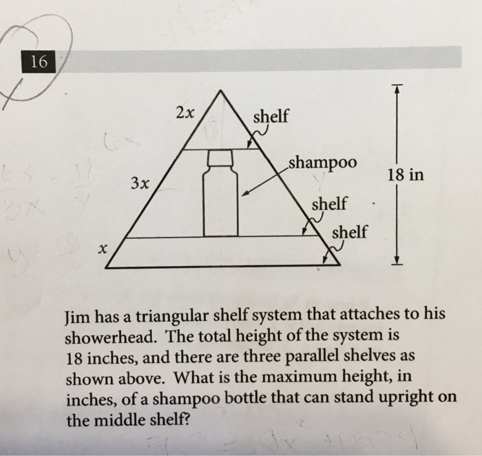 The total height of the system is 18 inches and there are three parallel shelves as shown above. Jim has a triangular shelf system that attaches to his shower head. Shelf shampoo 18 in shelf shelf Jim has a triangular shelf system that attaches to his showerhead. Shelf shampoo 18 in shelf shelf Jim has a triangular shelf system that attaches to his showerhead. What is the maximum height in inches of a shampoo bottlc that can stand upright on the middle shelf. What is the maximum height in inches of a shampoo bottle that can stand upright on the middle shelf. Official SAT Test 4 Section 3 Question 16Jim has a triangular shelf system that attaches to his showerhead. What is the maximum height in inches of a shampoo bottle that can stand upright on the middle shelf. What is the maximum height in inches of a shampoo bottle that can stand upright on the middle shelf.