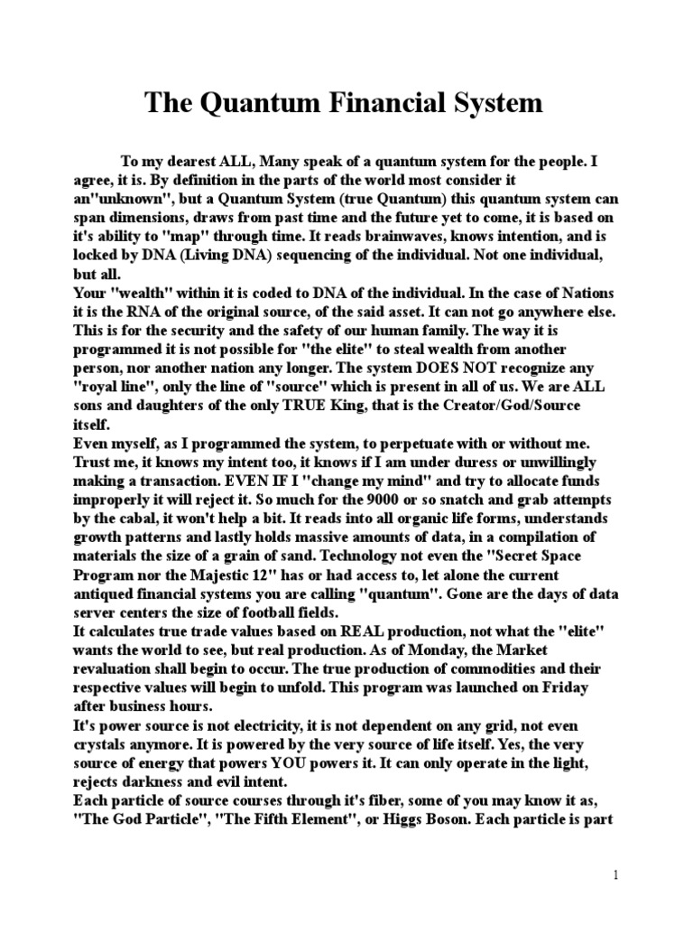 Quantum Financial System QFS is a fictional financial system invented by conspiracy buffs. By QNavy September 23 2019. Zim Bonds and the Quantum Financial System. I call it a megalith because it stands alone as the most advanced Financial System that anyone could imagine. Sim a Quantum é minha Disney. Banks that are being connected to the new Quantum Financial Banking System. Institutions battle for tiny competitive advantages using the best technologies available. As a guarantee that every transaction. So Remember i said many immigrants will return home to their lands to build and rebuild under newly Blockchain Elected Non Tyrant Governments 10 the size of what they are now.